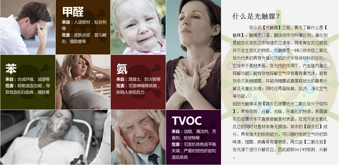 在認識【光觸媒】之前,要先了解什么是【觸媒】。觸媒是日語,翻譯成中文叫催化劑。催化劑是能在化學反應中加速反應速率,而本身在反應前后并不發(fā)生變化的物質。光觸媒是一種以納米級二氧化鈦為代表的具有光催化功能的光半導體材料的總稱。它涂布于基材表面,在光線的作用下,產生強烈催化降解功能:能有效地降解空氣中有毒有害氣體;能有效殺滅多種細菌,并能將細菌或真菌釋放出的毒素分解及無害化處理;同時還具備除臭、抗污、凈化空氣等功能。 稻田光觸媒采用【磷灰石被覆納米二氧化鈦分子結構】,具有吸附、分解、去除、無毒化的特質。表面磷灰石包覆技術不直接接觸基材表面,在充分發(fā)生氧化反應的同時對基材本身無腐蝕。其中的【磷灰石】成分,具有強大的吸附能力,可以隨時吸附空氣中的異味源、細菌、病毒等有害物質,再交由【二氧化鈦】在光源下進行分解反應,因此能夠24小時吸附、分解